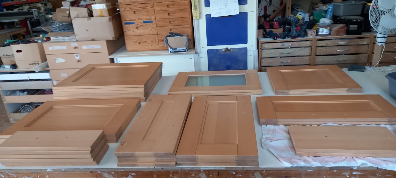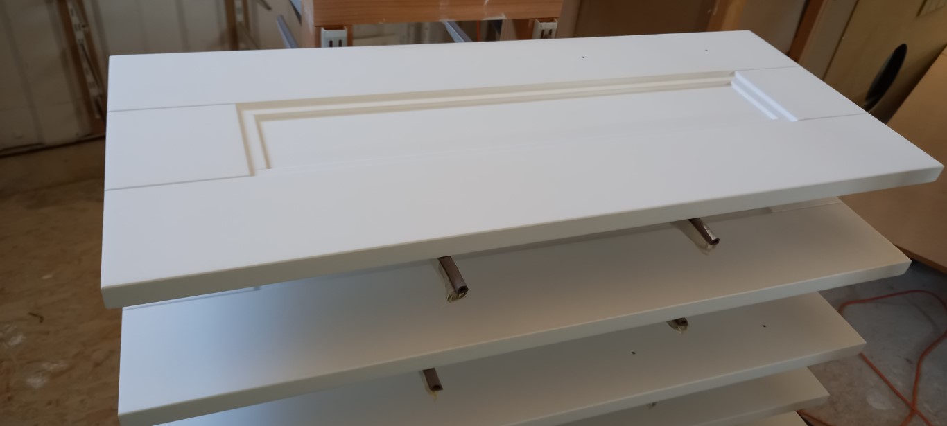 Refinished in our Great Chesterford workshop, these kitchen door and drawer fronts were resprayed for a Saffron Walden residence.